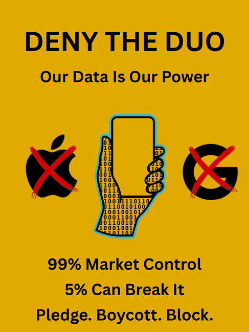 I Pledge to Deny the DuopolyI refuse to keep giving my data, money, and freedom to Apple and GoogleI pledge to avoid YouTube and Apple Stores for one month to reclaim our power and protect our democracy.We don’t need 100%. If just 5% of us act, they’ll feel it. Let’s create a people-powered firewall against digital tyranny. We strike once we reach our 15 million strong!I pledge to be part of the 5%.